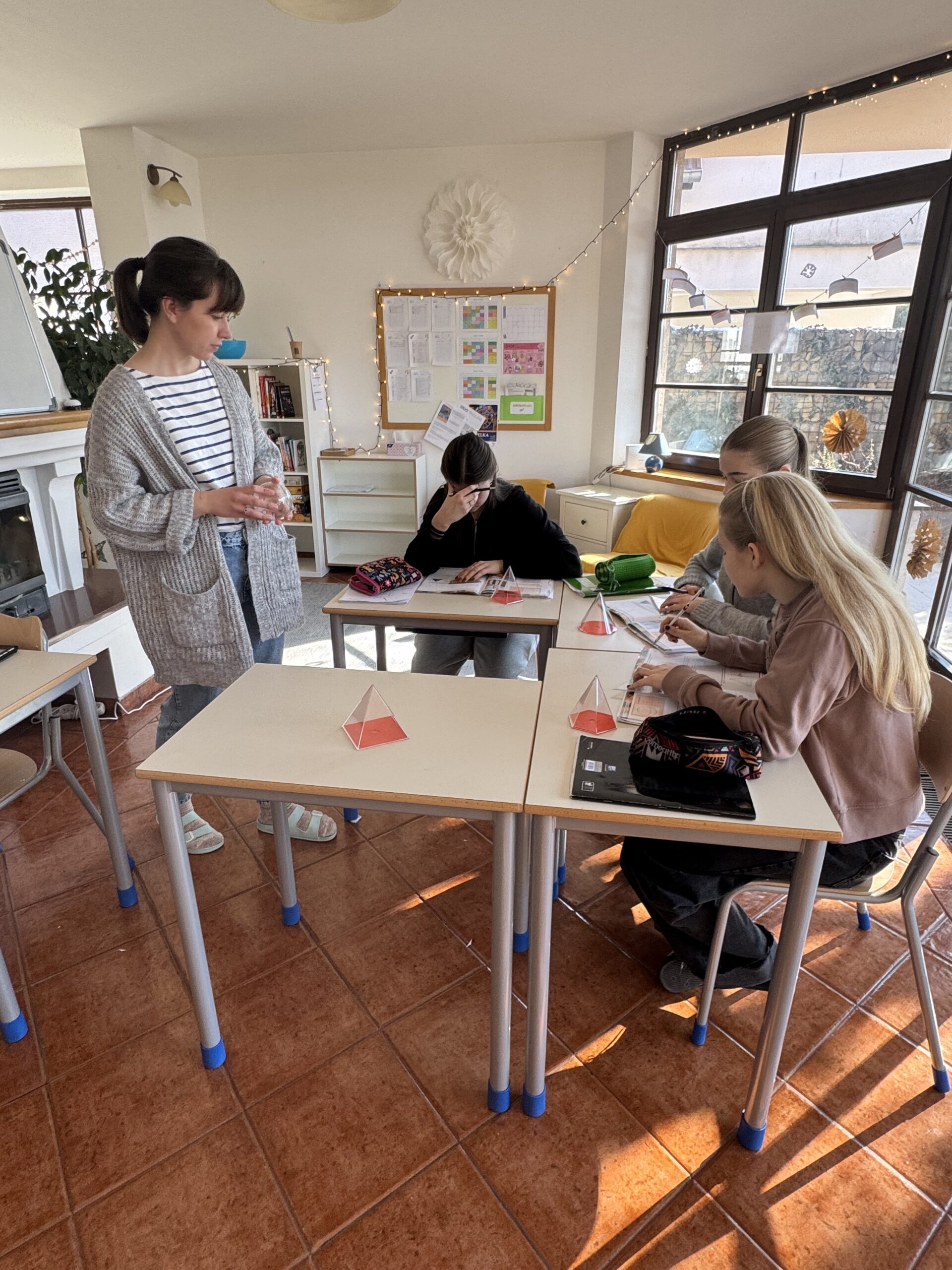 Žáci se učí v malých skupinách, s osobním vedením a každodenním kontaktem s angličtinou — což je připravuje na české přijímací zkoušky, bilingvní studium i život mimo školu.
